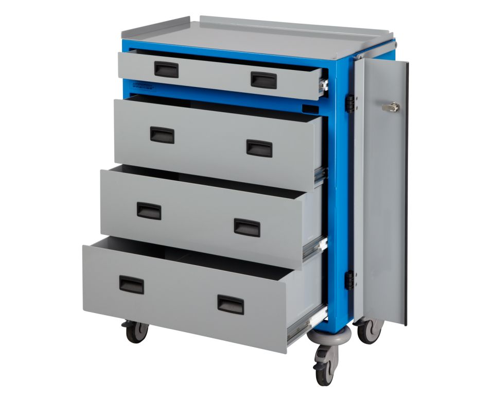 Dieser antimagnetische MRT Medikamentenwagen verfügt über vier zentral abschließbare Schubladen. Die Ablage kann hinten und seitlich aufgekantet sein und als Arbeitsfläche verwendet werden. Seitlich befindet sich eine Normschiene zum Befestigen von MRT Zubehör. Auf vier Laufrollen (75 mm) lässt sich dieser MRT-Schubladenwagen leicht verschieben. Zwei Rollen sind blockierbar. Puffer über den Rollen mit einem Durchmesser von 125 mm schonen Türen und Wände.