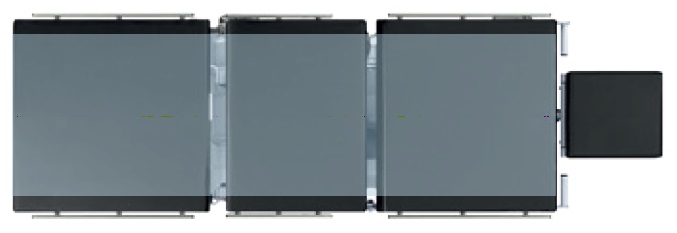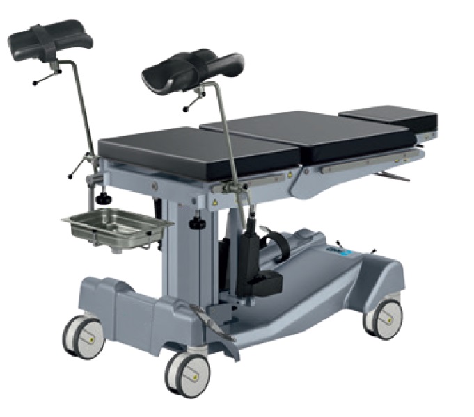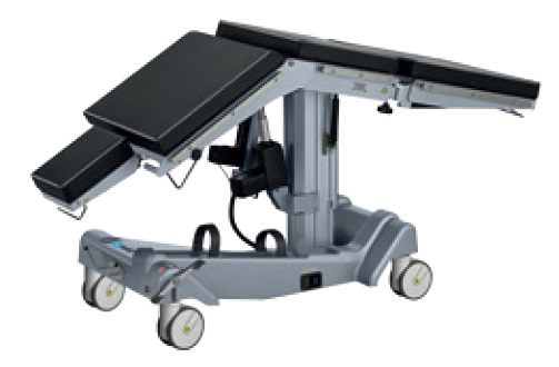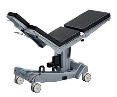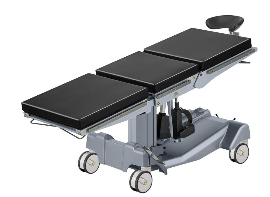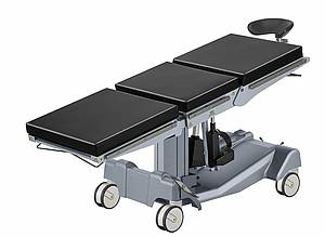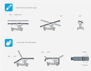 Ein Operationstisch mit vier- oder fünfteiliger Liegefläche in vier Segmenten ( Kopfplatte, Rückenplatte, Sitzplatte und geteilte oder einfache abnehmbare Beinplatten. Der Operationstisch ist elektrisch verstellbar und wartungsfrei. Das Rückenteil kann manuell mit pneumatischer Unterstützung verstellt werden. Die Liegefläche ist röntgenstrahlendurchlässig und mit abnehmbaren, flüssigkeitsdichten und desinfektionsmittelbeständigen Polstern ausgestattet. Optional sind andere Polsterstärken lieferbar.